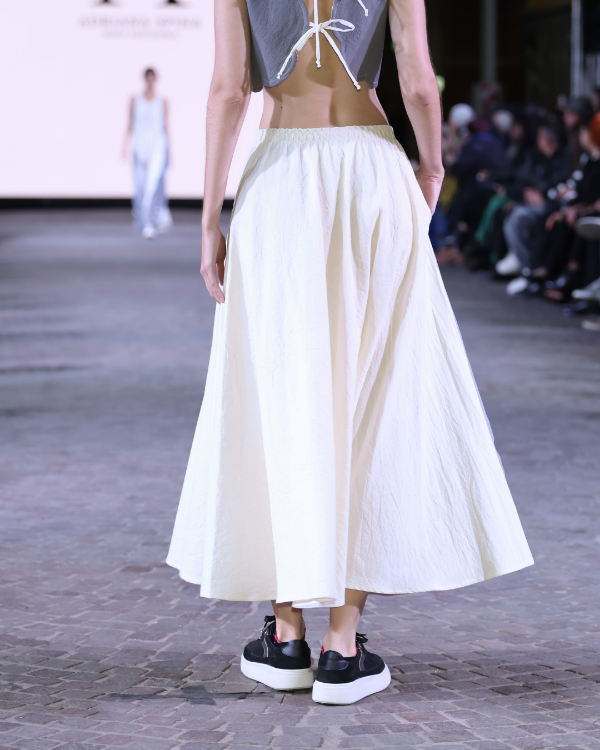 Tiene elástico en la cintura y bolsillos invisibles en los laterales. Cómoda, práctica y única.